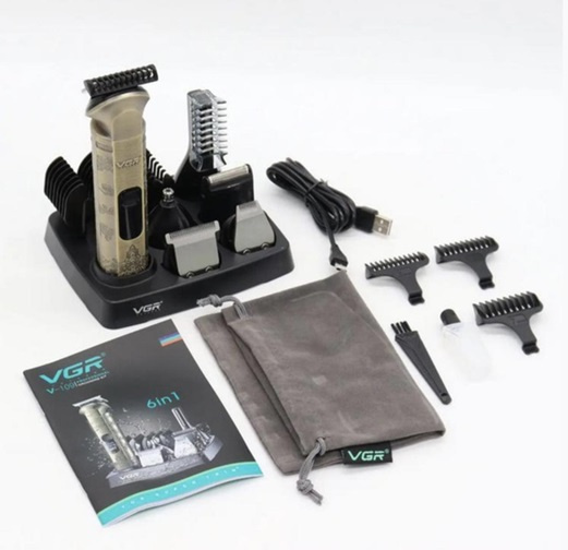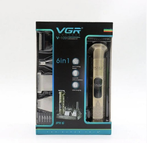Машинка для стрижки 6 в 1 Vgr V-109 — это многофункциональный набор, который с легкостью заменит вам несколько устройств. Комплект из шести сменных лезвий из нержавеющей стали решает множество различных задач. Корпус триммера выполнен из металла золотого цвета, гравированного в морском стиле. В основании располагается светодиодный дисплей, отражающий остаточное время заряда в процентах. Работа триммера возможна как от сети, так и от автономного аккумулятора.