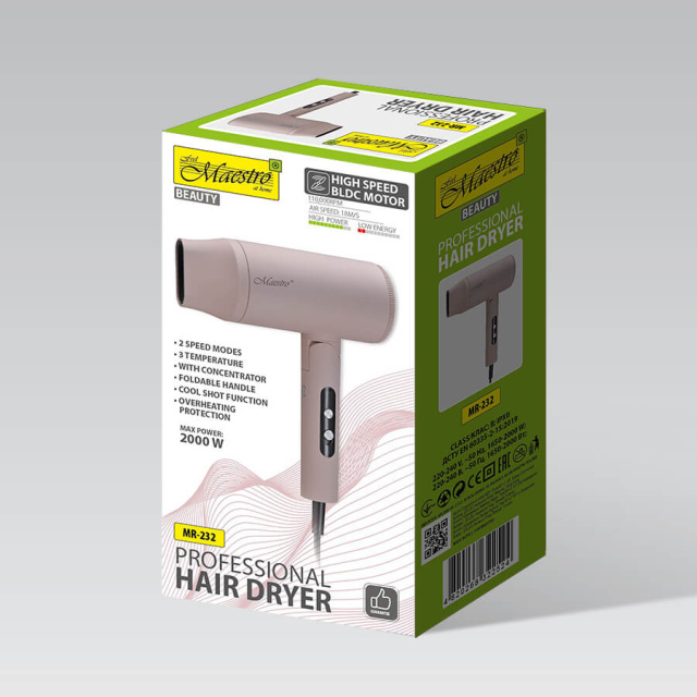 Фен Maestro MR-232 — компактный и стильный прибор для ежедневной укладки и сушки волос. Оснащён мощностью 2000 Вт, обеспечивает бережный уход и удобное использование.