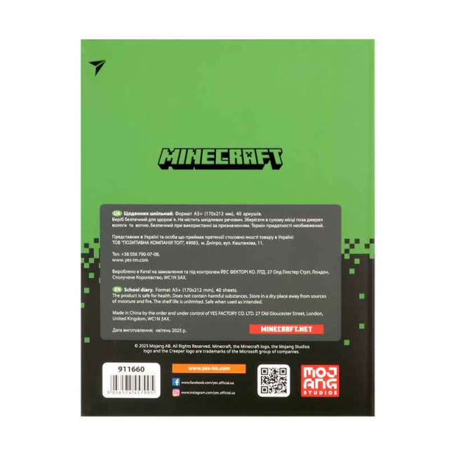 Дневник школьный интегральный А5 YES Minecraft 911660 40 листов, Хмельницький