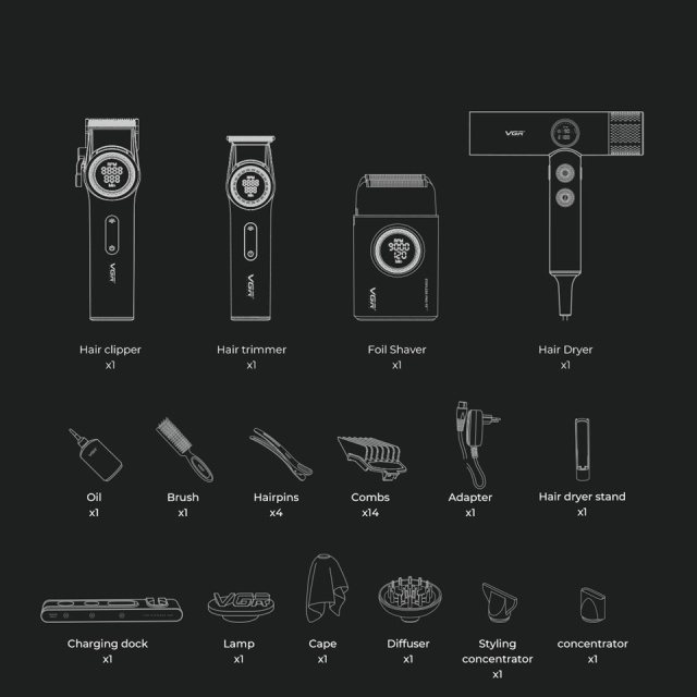 Комплект длят стрижки Vgr Steplerss Комплект длят стрижки Vgr Steplerss представляет собой стильную профессиональную модель, которая оснащена всеми